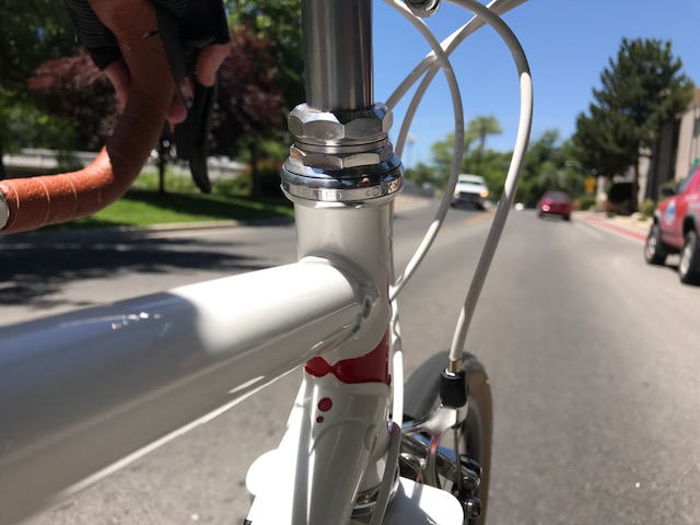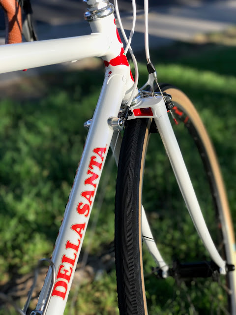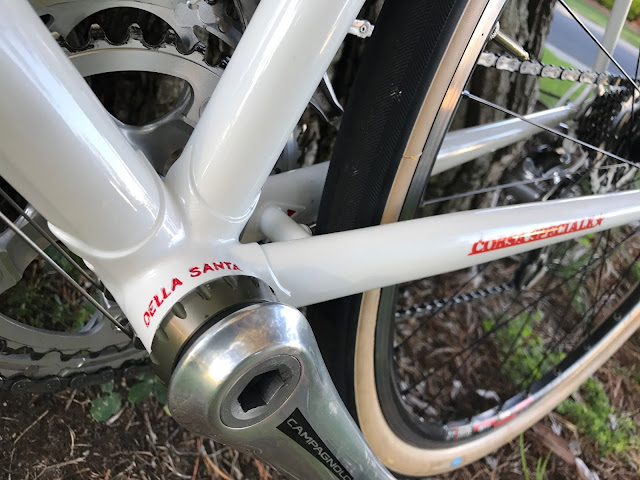 Essentially this has been my experience when I have put the last Della Santa through its paces on several rides. When I started climbing and needed an easier gear, a quick flick and the chain dropped into place. When I needed to crank it up on the flats or downhill...ditto. Yes, there was a bit of trimming from the big ring to the little ring on the crankset, but no more than with my modern click shifting groups. So in the end, I built up a steel lugged old school L'Eroica style bike frame built by the late grandmaster of frame building, Roland Della Santa, with a modern silver 10 speed Campagnolo group, super light racing American Classic wheelset, downtube friction shifters, Brooks saddle, threaded fork, clipless pedals, and a carbon seatpost. Makes total sense to me. A gallery of photos: