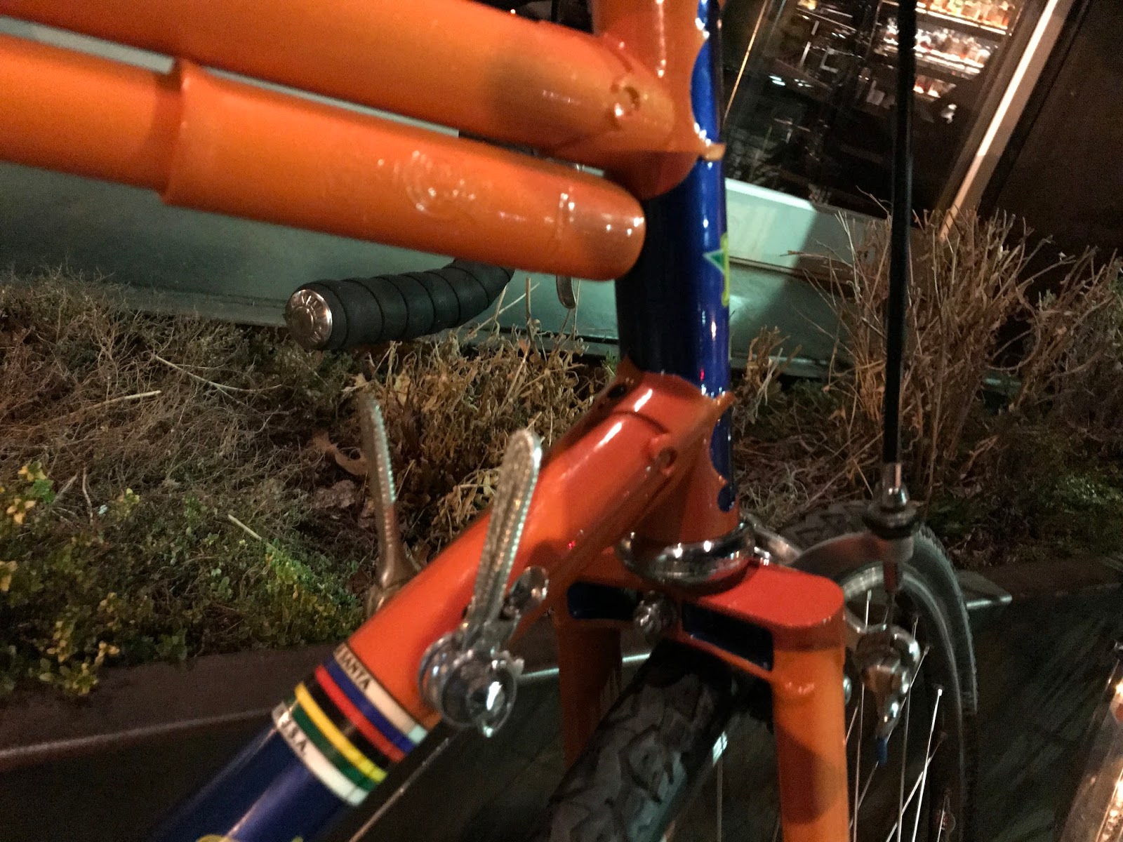 Friend and fellow Rambler, Jake, unveiled his new Della Santa at the club dinner last night and this is definitely a situation where the pictures are going to say more than my words. Be that as it may, the bike is built up for riding L'Eroica with this parts spec and has room for 32s (or perhaps bigger?) on it. The Molteni paint scheme, the fork crown, those lugs...just lovely! Sorry the photos are a bit dark but it was...dark outside at night. Go figure.